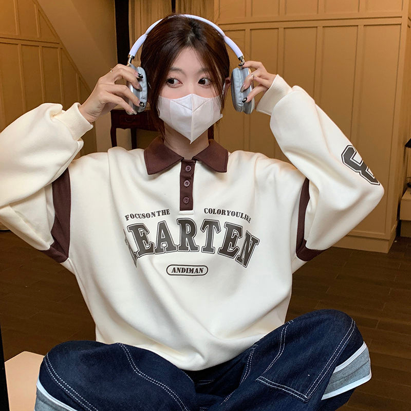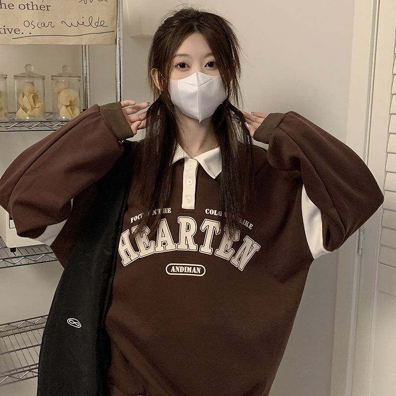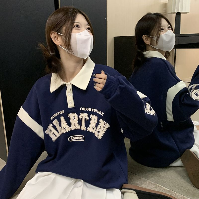 M-Xxl Kopi/Aprikot/Biru/Sweater Kerah Polo Warna Kontras Atasan Lengan Panjang Wanita Gaya Korea, Tiga Warna Adalah Opsi