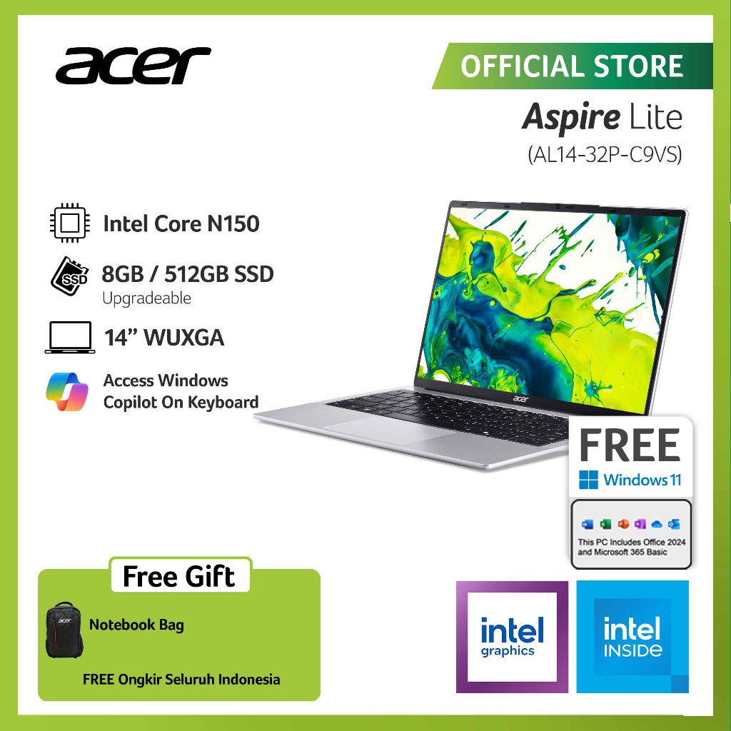 ACER LAPTOP ASPIRE LITE AL14-32P-C9VS/AL14-32P-C1ES/AL14-32P-C3HJ 14" WUXGA INTEL N150 RAM 8GB STORAGE 512GB SSD INTEL G