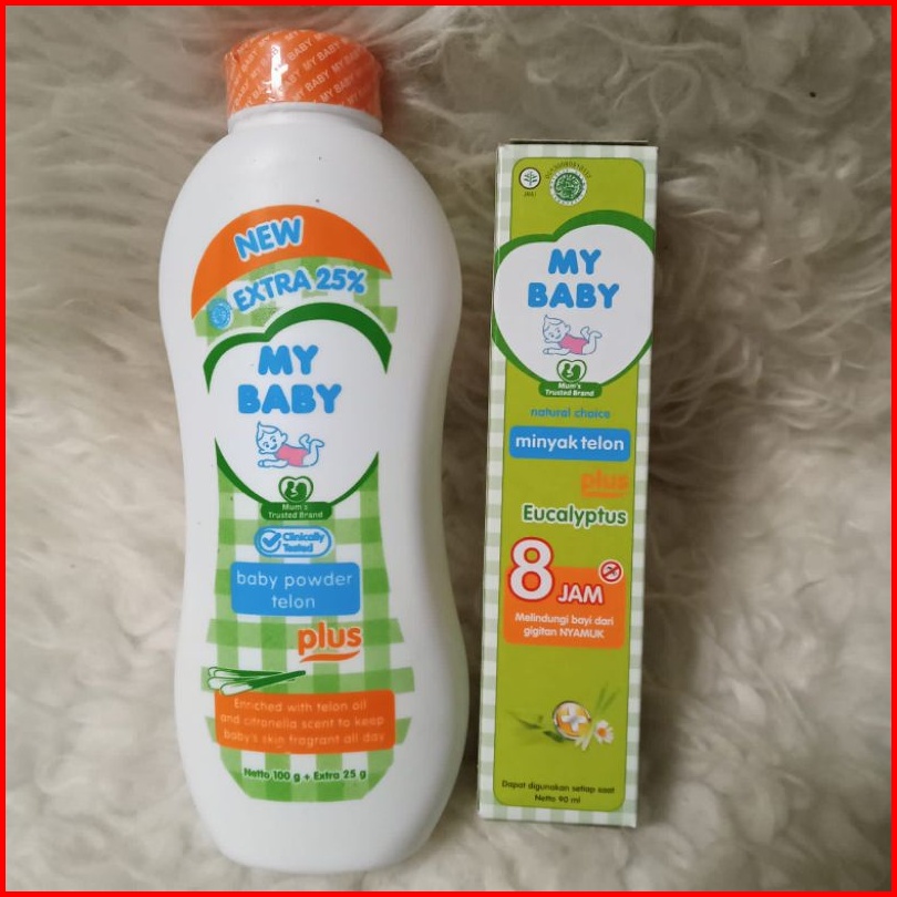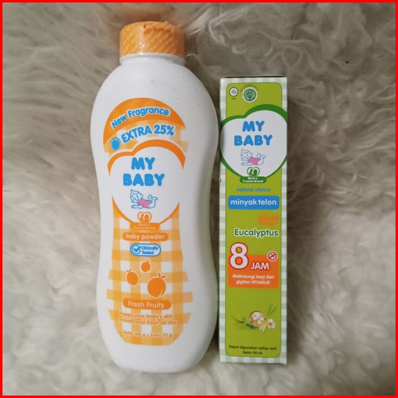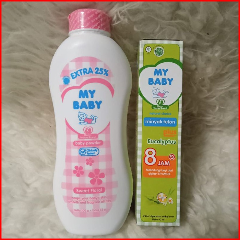 Paket Hemat Perawatan Bayi My Baby Minyak Telon 90ml Eucalyptus Bedak 90gr Extra 22 5gr Bedak Kirim Random