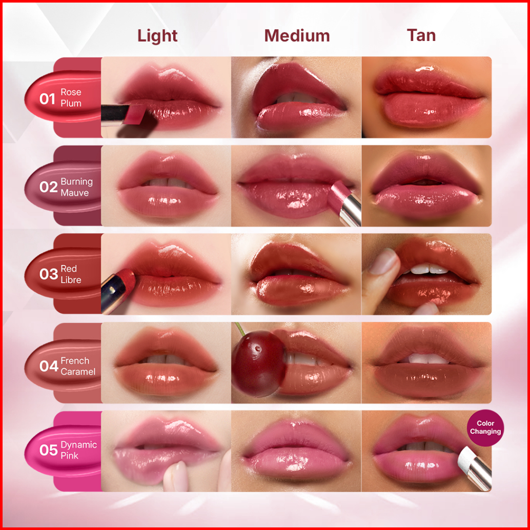 01 Rose Plum, 02 Burning Mauve, 03 Red Libre, 04 French Caramel, 05 Dinamic Pink