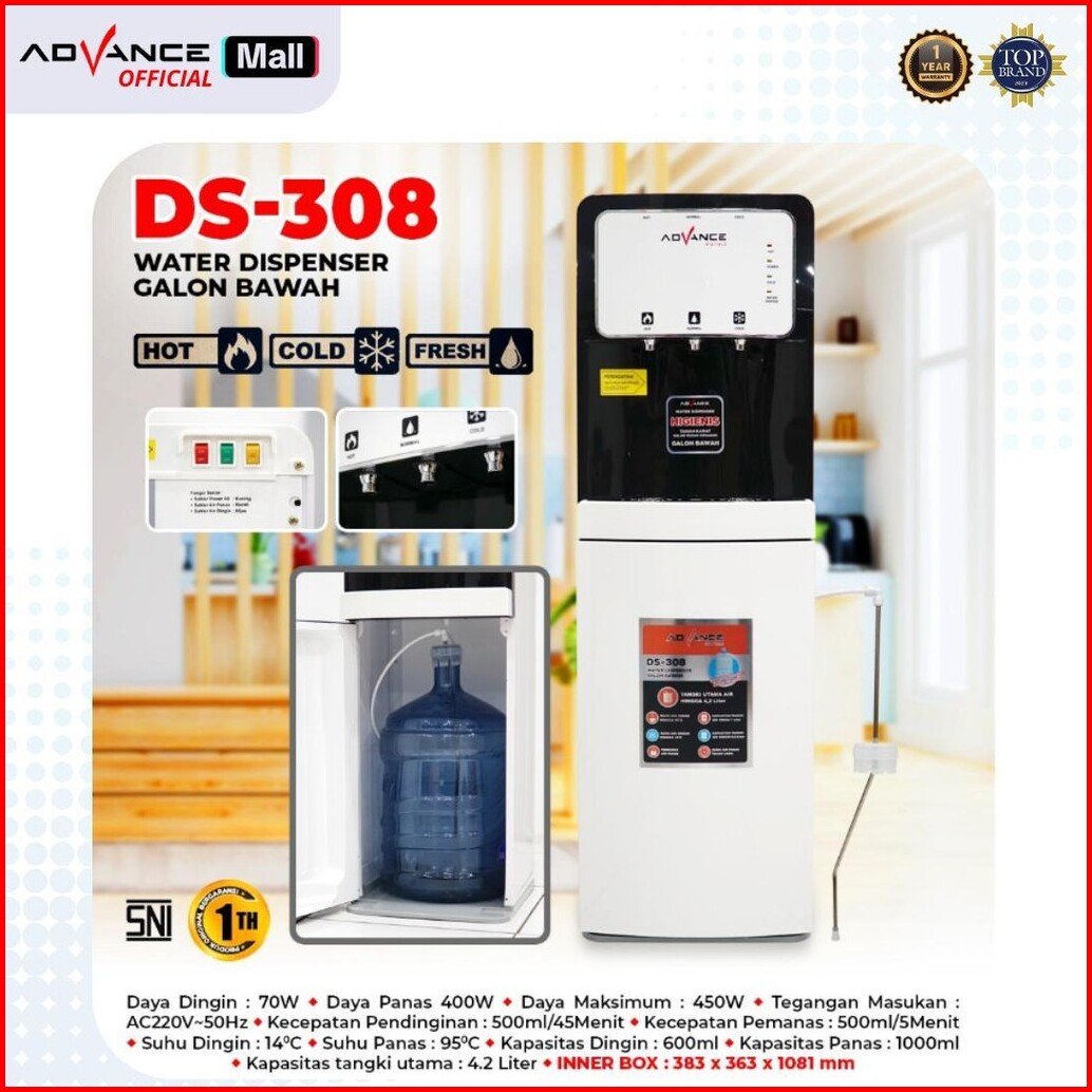 Advance Dispenser Air Galon Bawah Ds-308 Low Waat 3in1 Hot Cool Fresh Daya Maksimal 400 Watt Garansi Resmi 1 Tahun