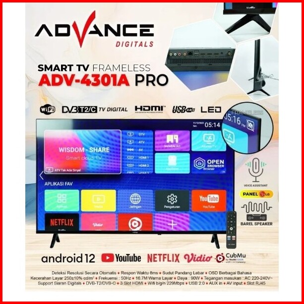 Adv-4301a Pro Smart Tv Google Tv Goggle Assistant Tv Android 43 Framless Full Garansi Resmi 12 Bulan Digital Tv