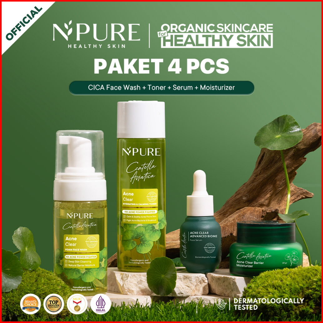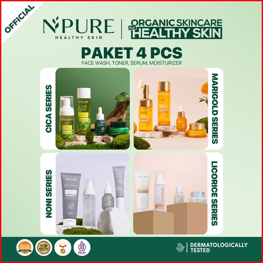 Paket 4pcs - Npure Paket Face Wash Toner Serum Moisturizer Cica Acne - Marigold Anti Aging - Noni Sensitive - Licorice B
