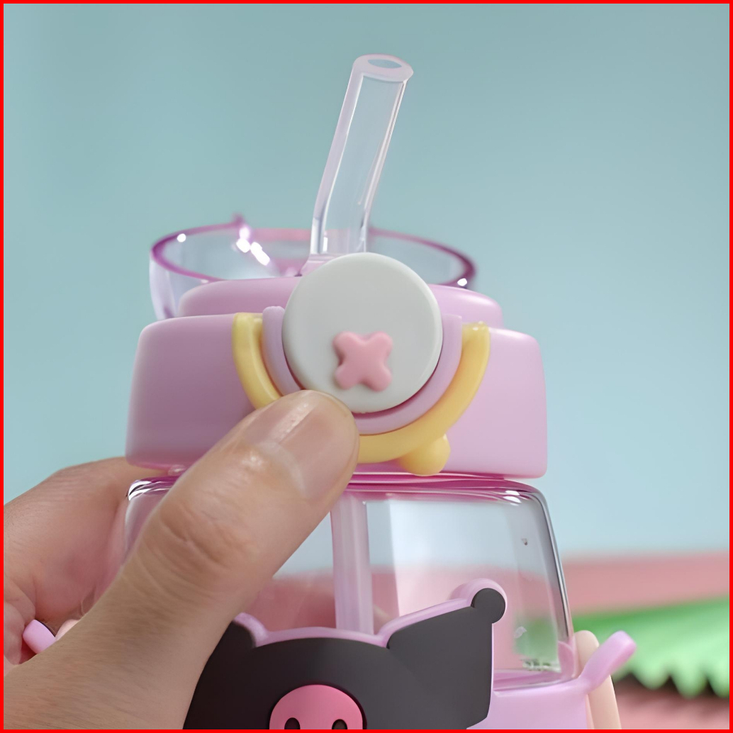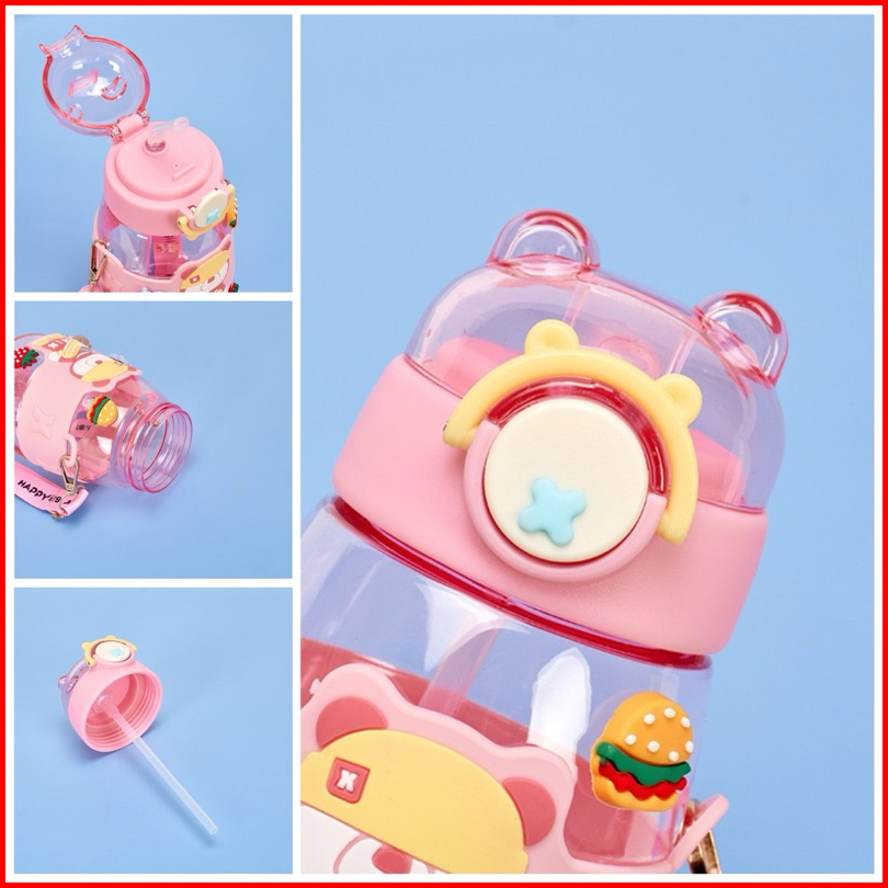 Botol Minum Anak Lucu Happy Bear 600ml Free Sedotan Tali Stiker