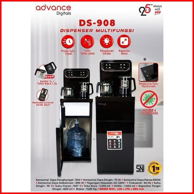 Advance Ds-908 Water Dispenser Air Galon Bawah 3in1 Hot Cool Fresh Paylater Daya Maksimal 600 Watt Garansi Resmi 1 Tahun