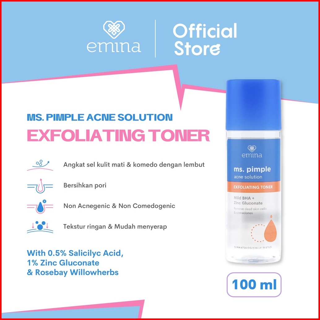 Emina Ms. Pimple Acne Solution Exfoliating Toner 100 Ml - Angkat Sel Kulit Mati Dan Komedo Atasi Jerawat Dalam 7 Hari