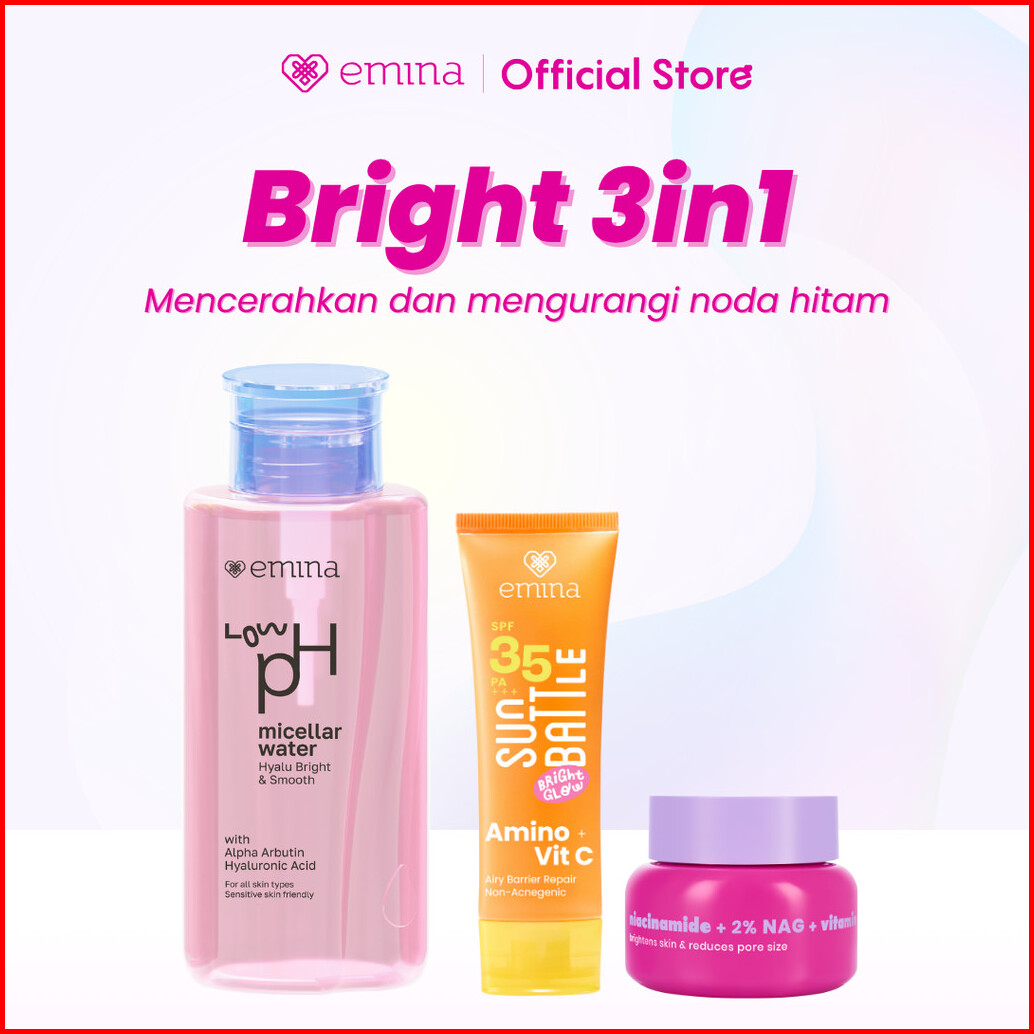Emina Bright Glow Set Bundle All In 7in1 Paket Skincare Hyalubright Micellar Water- Bright Stuff Face Wash- Bright Stuff
