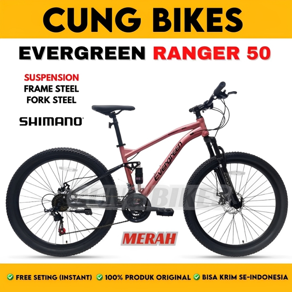 Sepeda Gunung MTB Evergreen Ranger R50 Full Suspension ukuran 26 Inch 3x7 speed Shimano