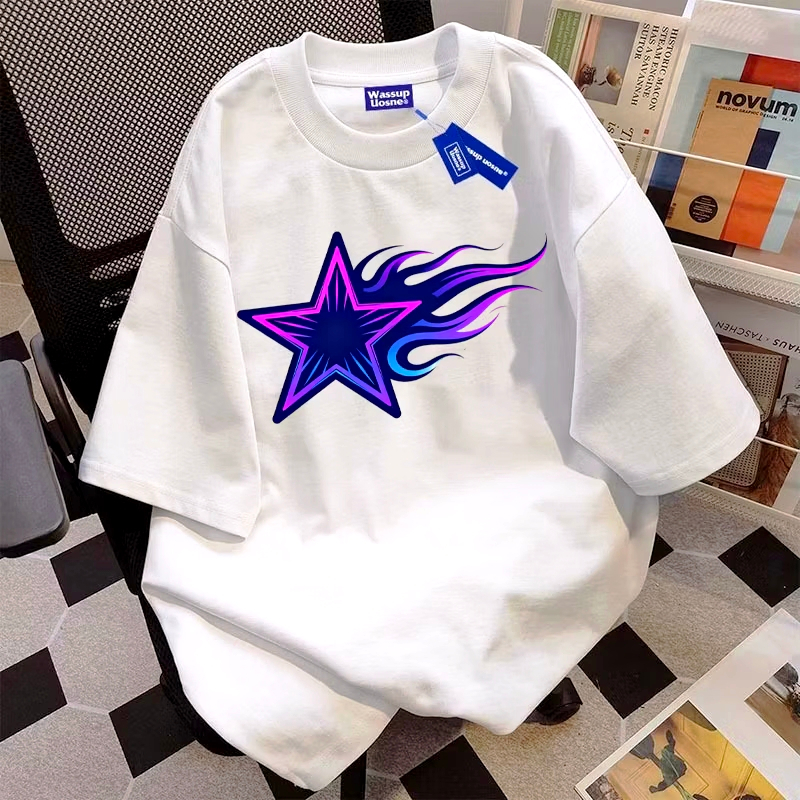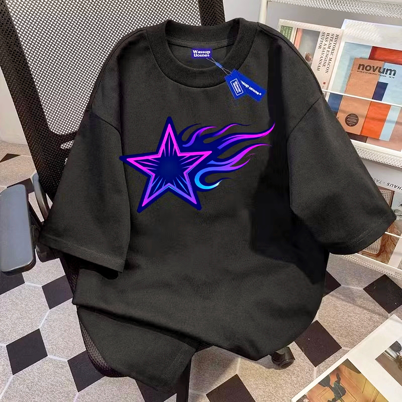 Kaos Hitam Katun Oversize Cetak Bintang Api Cocok Berbagai Situasi Sehari-hari
