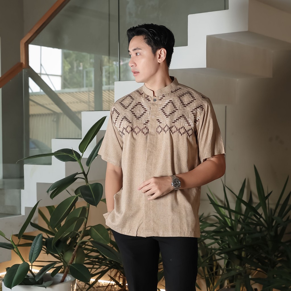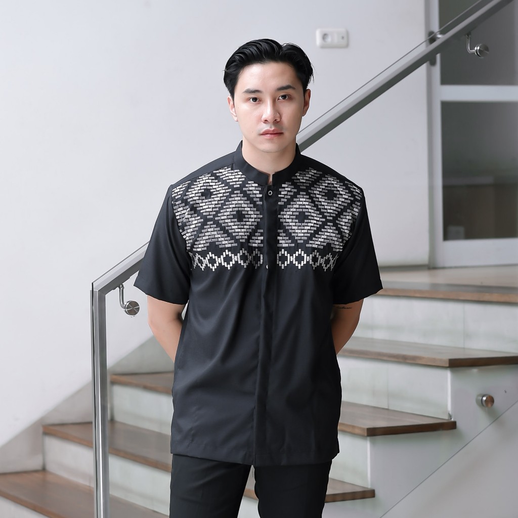 baju koko al wandi 02 bordir pria terbaru lengan pendek kekinian bahan katun madinah premium warna hitam khaki biru abu-