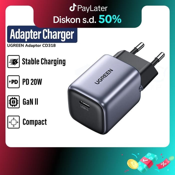 Wall Charger Adaptor UGREEN 20W USB Type C PD QC 3.0 GaN Fast Charging Adapter Kabel Cable - 20W CD318