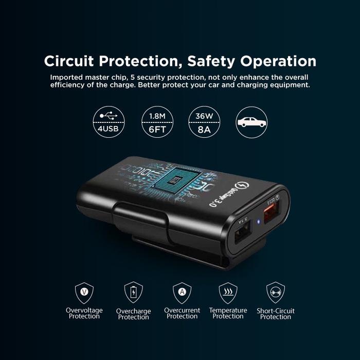 Car Charger Mobil Fast Charging 3.1A 3.0A 2.4A Qualcomm dengan 4 Port USB QC3.0 dan Kabel 1.7m untuk Ponsel dan Tablet