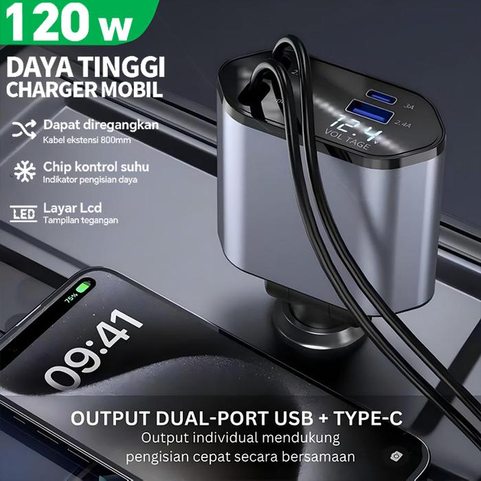 Pengisi Daya Mobil 120W Pengisian Daya Super Cepat USB Dan Adaptor Type C dan Lightning Panjang Kabel 880mm - hitam
