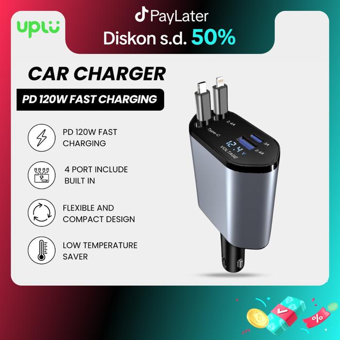 UPLU Pengisi Daya Mobil 120W Super Cepat USB Type C & Lightning Kabel 880mm untuk Ponsel dan Perangkat Digital