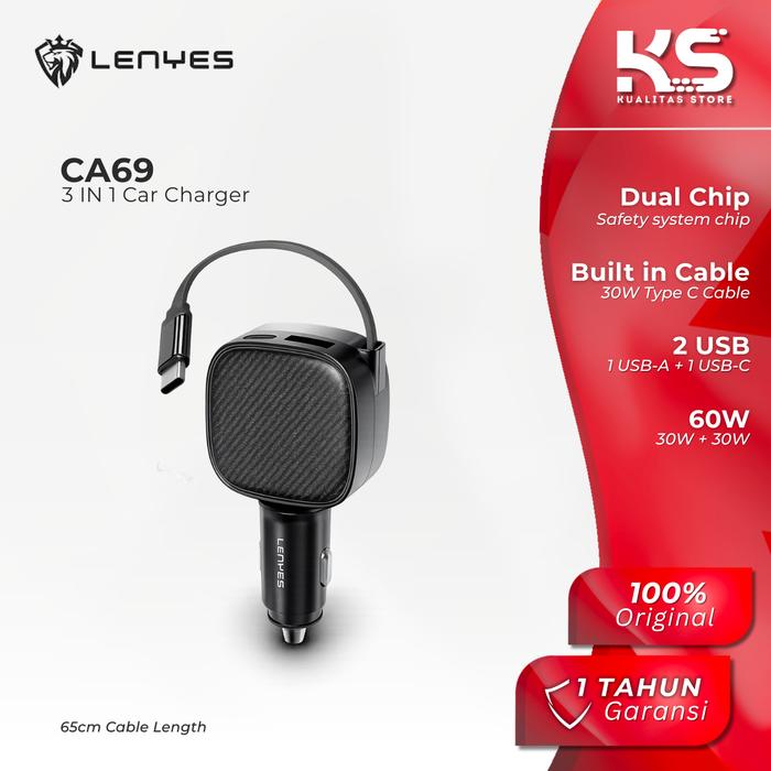 LENYES Car Charger Dual USB 30W+30W Fast Charging with Built in Type C Cable Dual Safety Chip CA69