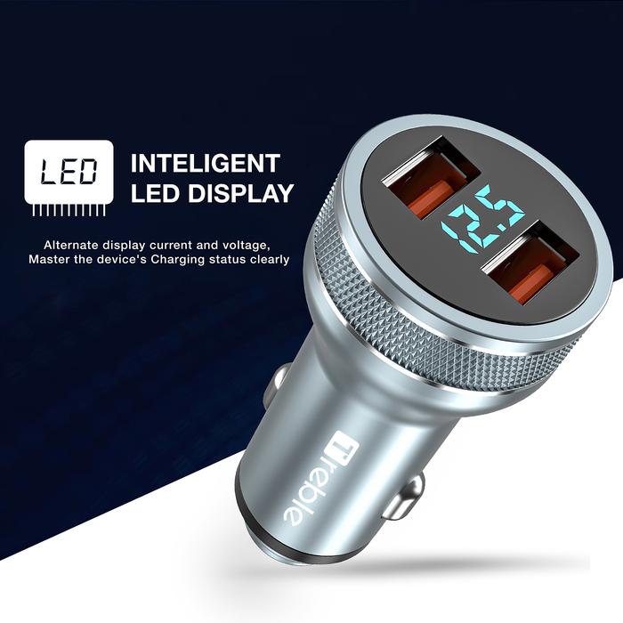 Car Charger Colokan Mobil 2 Ports USB QC3.0 36W TREBLE with LED Screen Silver - TMC4 Aluminium Metal