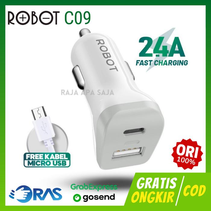 Car Charger Mobil Motor USB Power Delivery Type C Fast Charging PD 2.4A 2 Output Port Robot C09