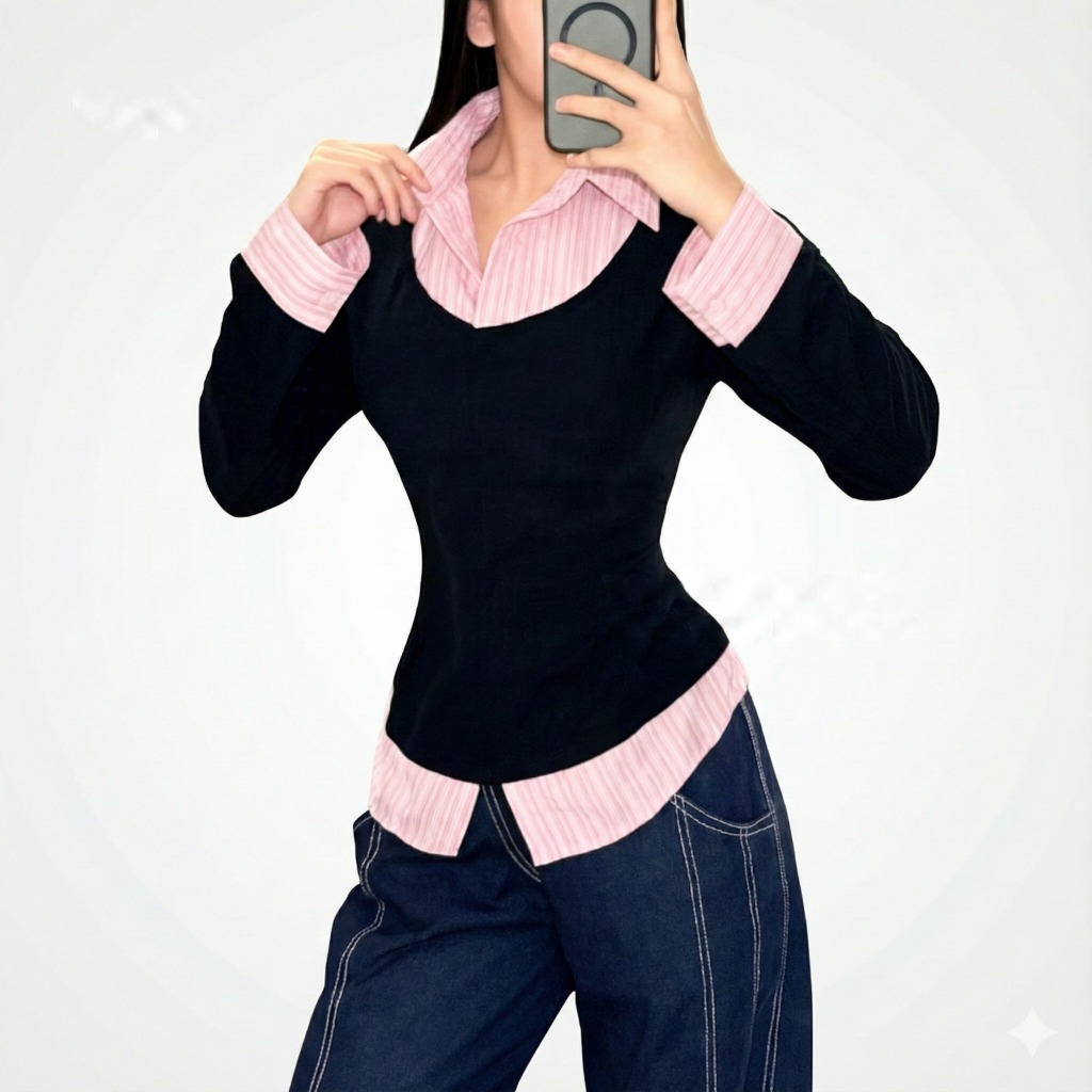 D'XAVIER - Yareu Wispie Girl Boss Fitted Shirt | Kemeja kerja wanita Kombinasi fit stripe karet