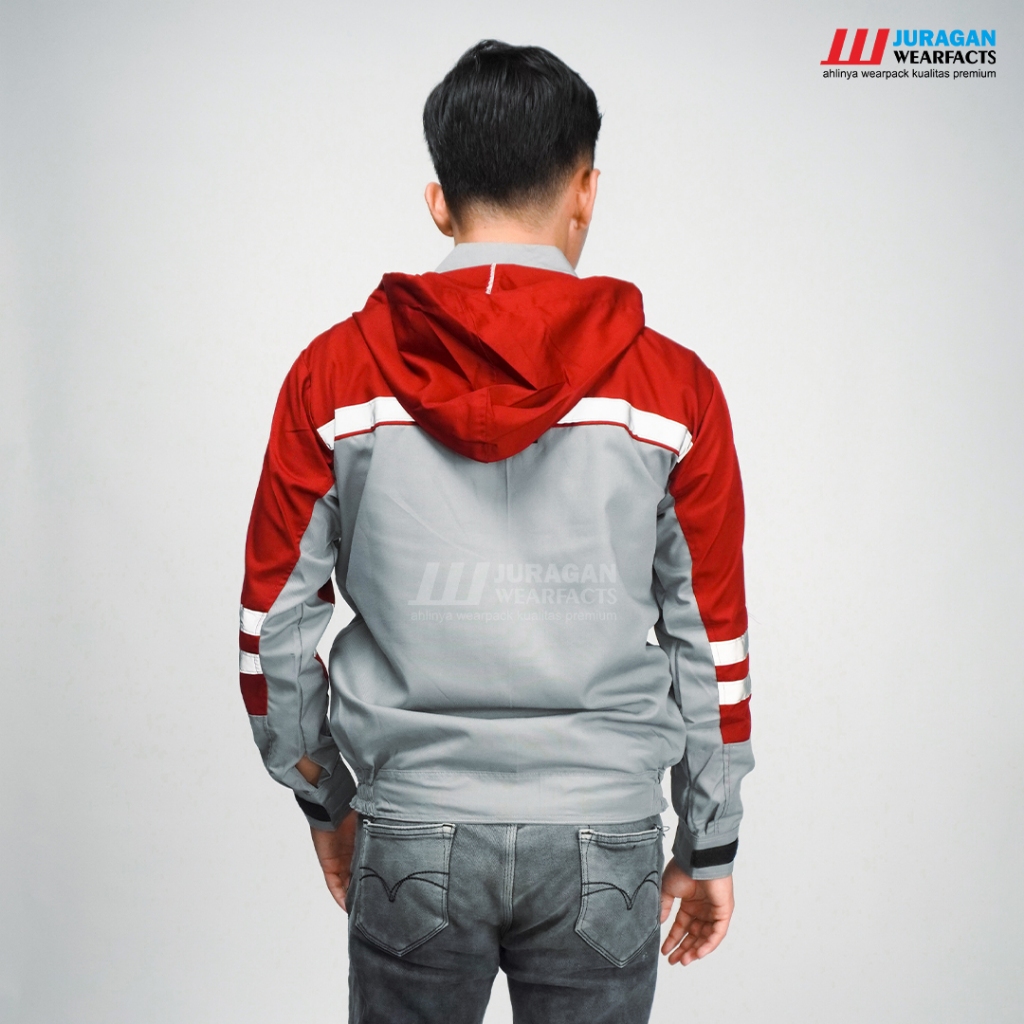 Juragan Wearfacts - Wearpack Kerja Segala Cuaca Warna Merah Maroon Kombinasi Abu