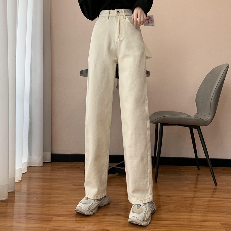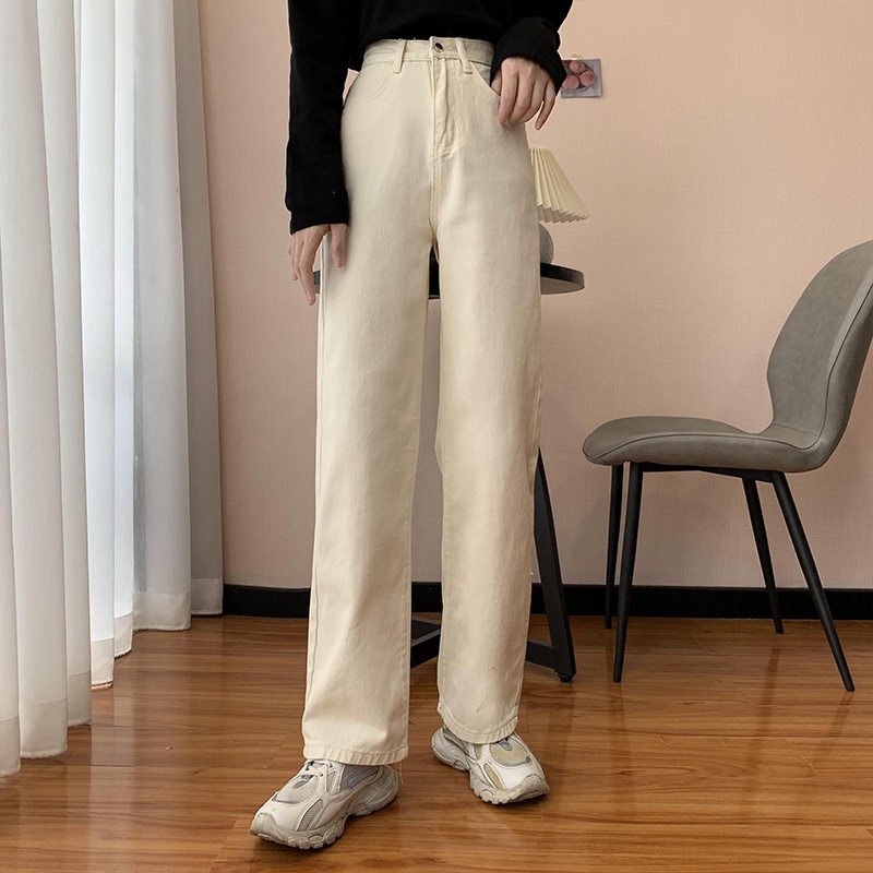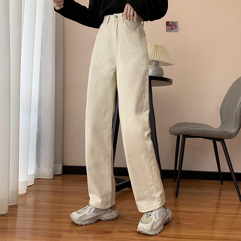 Celana denim kaki lebar wanita retro beige KECILmalis gaya Korea
