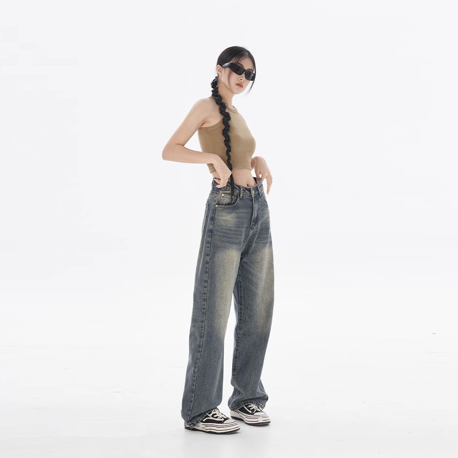 Biru retro Highwaist Celana Jeans Wanita Loose Kekinian