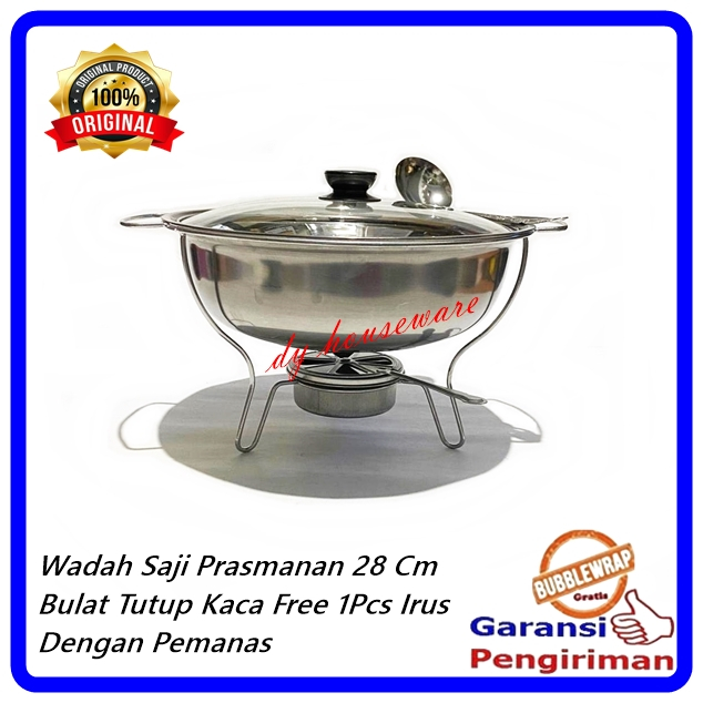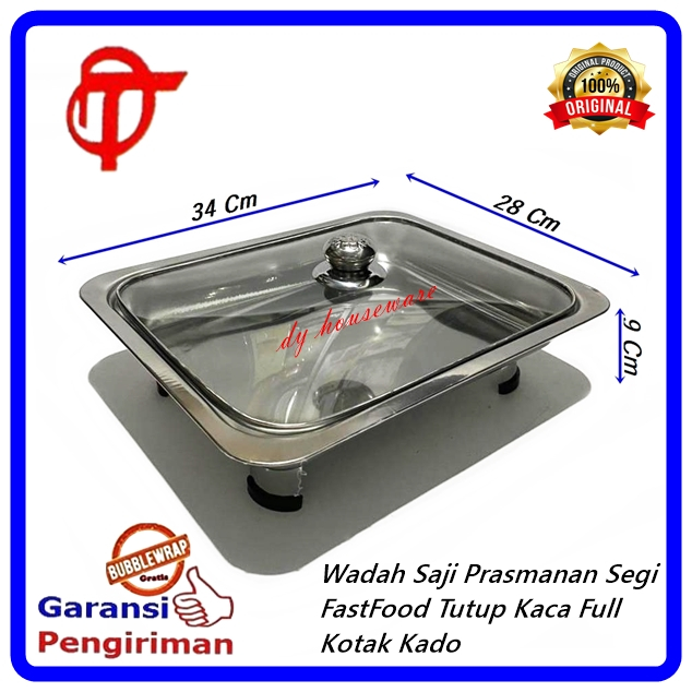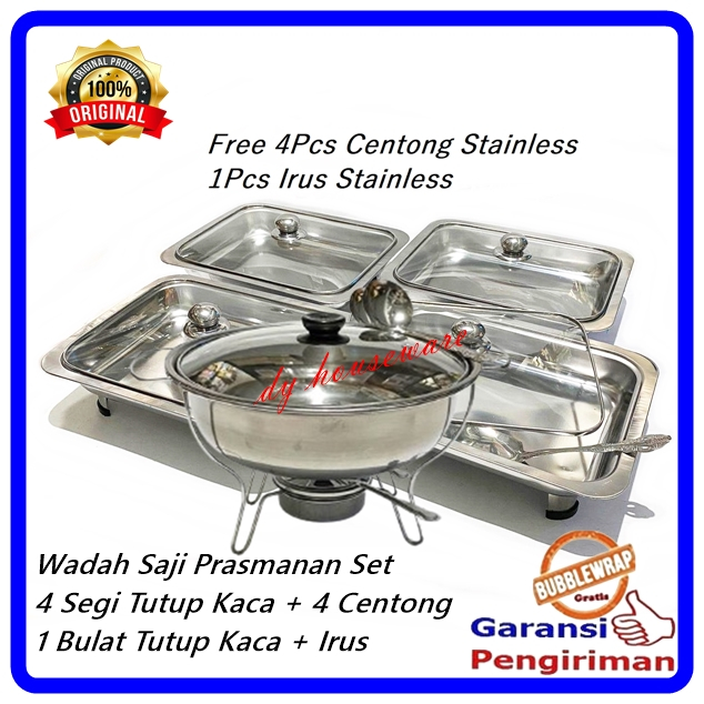 Prasmanan Wadah Saji Set 4 Segi 1 Bulat Stainless Tutup Kaca Kombinasi Free Centong Irus Stainless