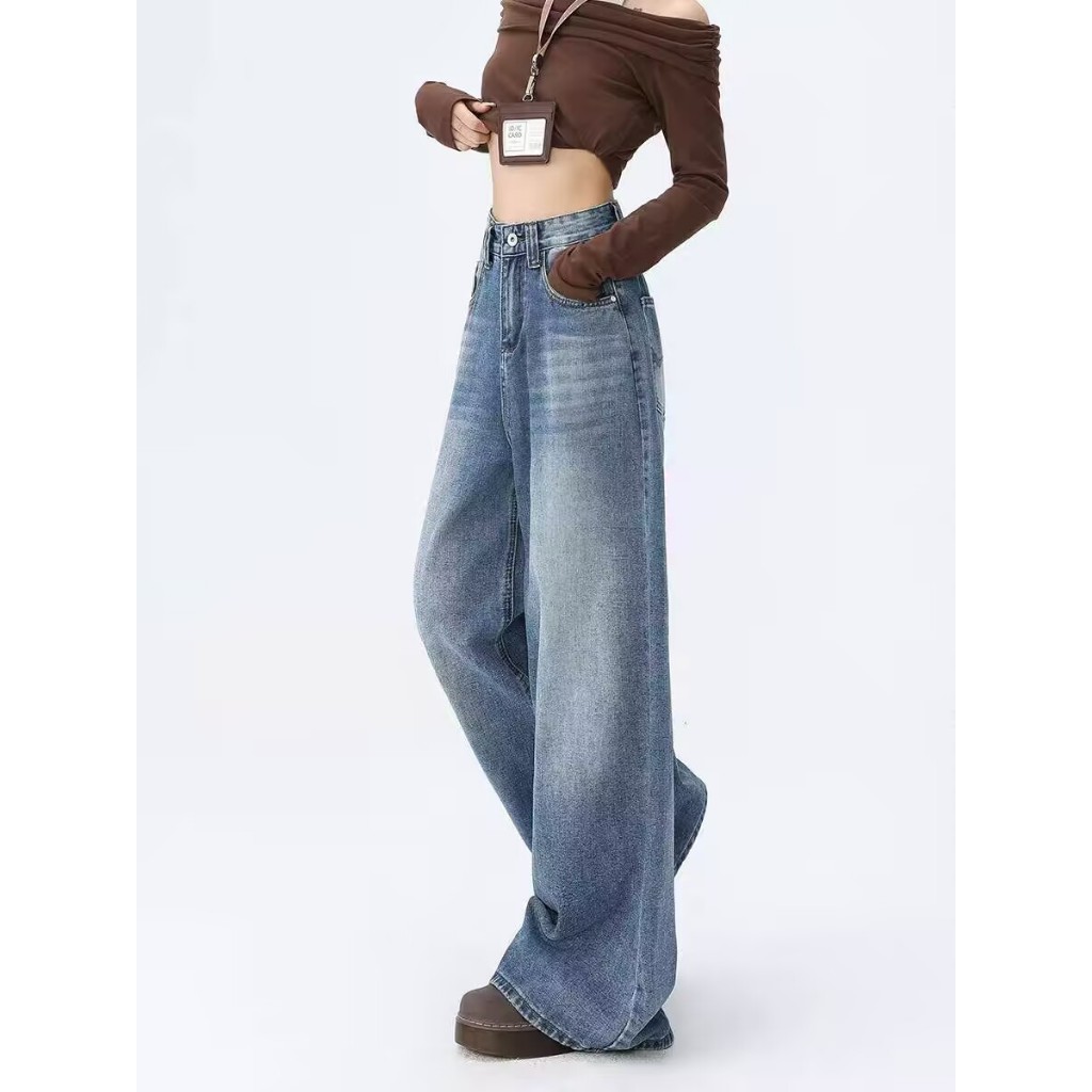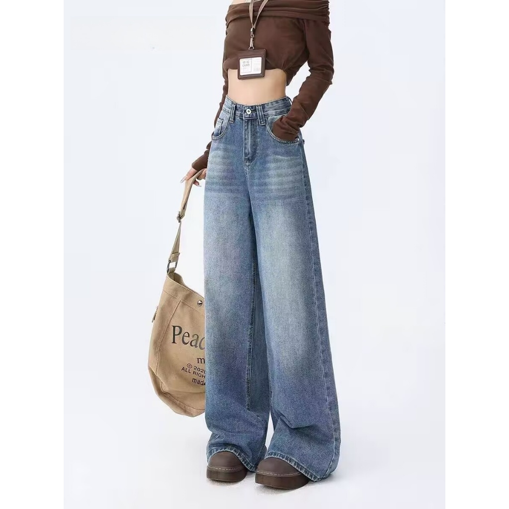 (S-6XL)Celana denim wanita gaya Korea, celana jeans pinggang tinggi dan kaki lebar