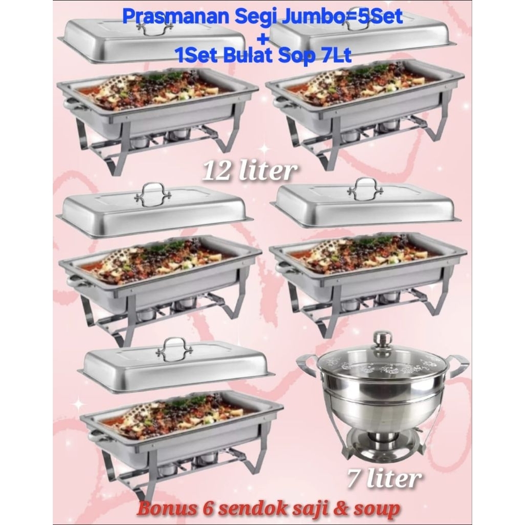 Prasmanan Chafing Dish Jumbo Paket Hemat 6Set (Segi Jumbo=5Set + 1Set Bulat Sop 7Lt/32Cm) + Bonus 6Pcs Sendok Sayur & So