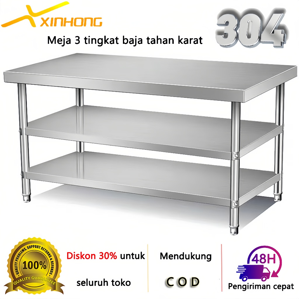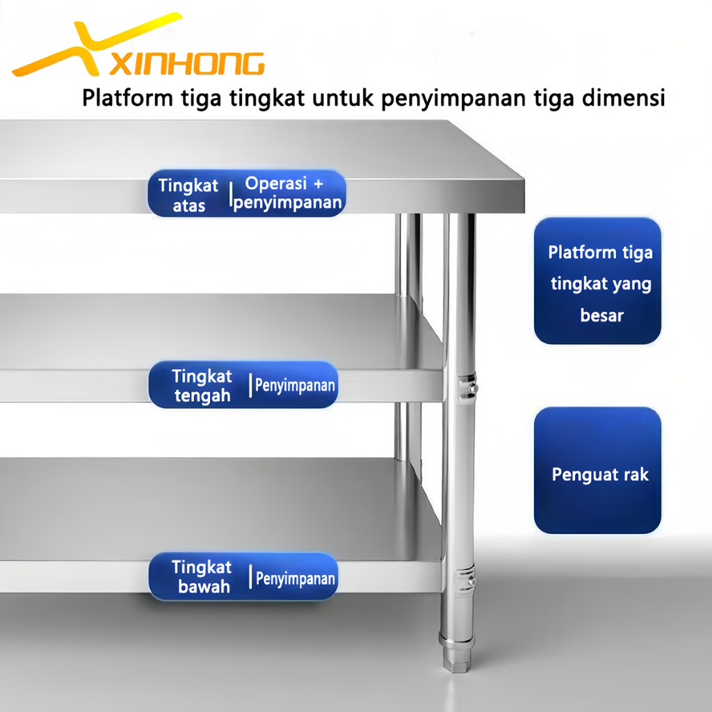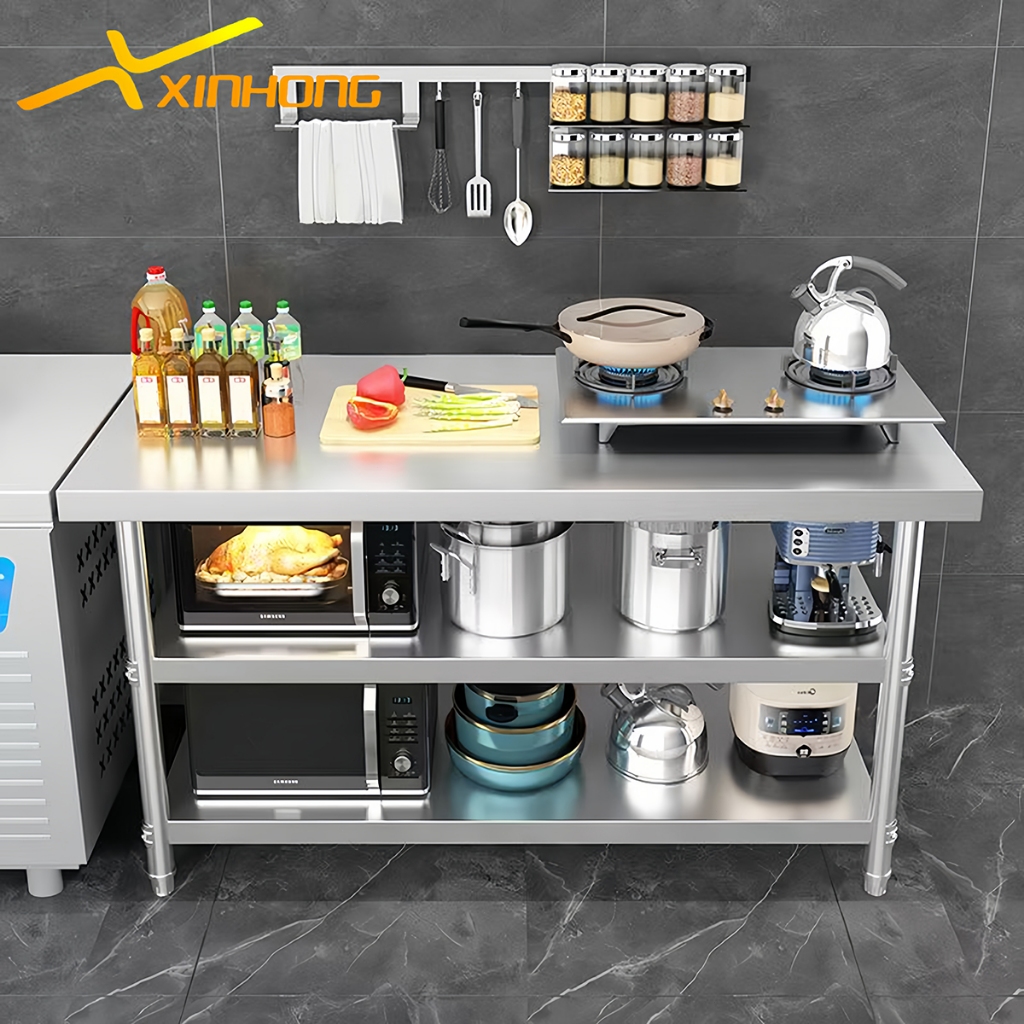 Xinhong Meja Stainless Steel 304 3 Lapis Kuat Komersial Penyimpanan Komersial Meja Stasiun Kerja