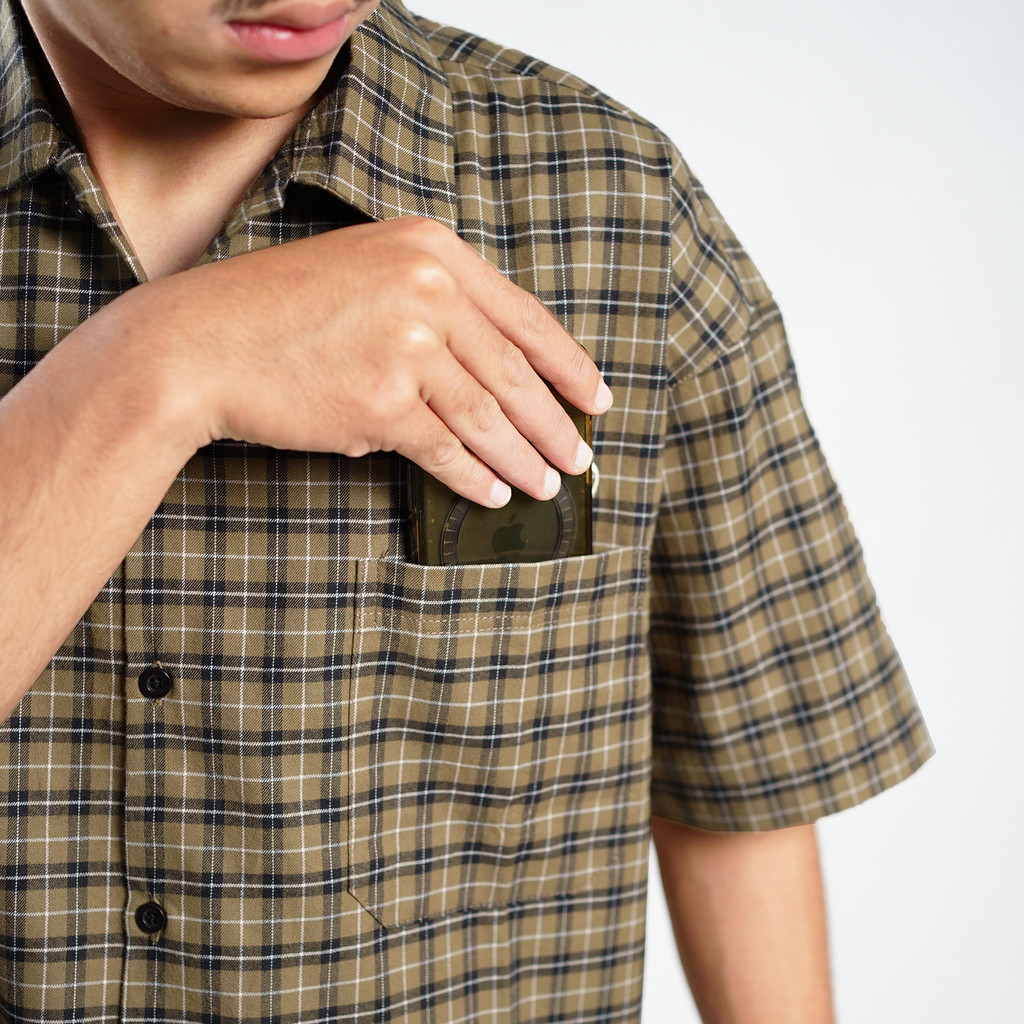 Gigg - Squared - Kemeja Boxy Flannel Pria Coklat - Kemeja Lengan Pendek Cowok - Boxy Shirt Brown