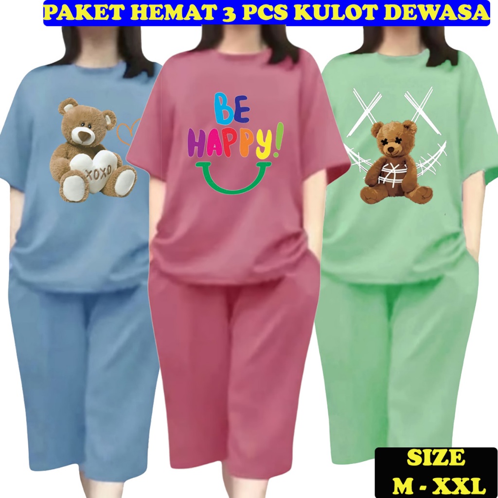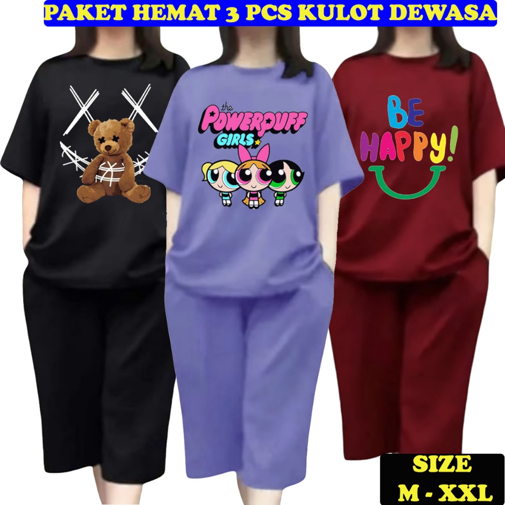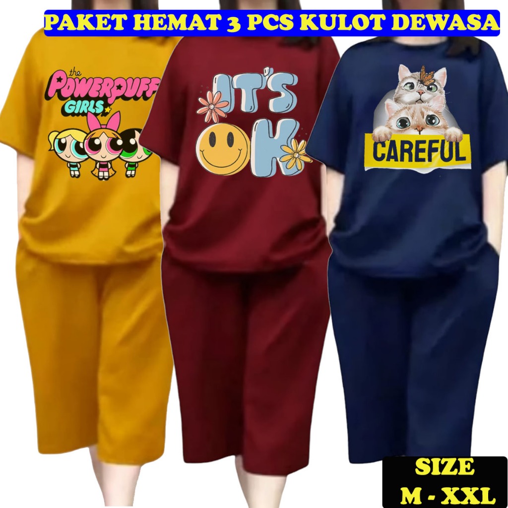 GF - GROSIR 3 Pcs Paket Setelan Celana Kulot 3/4 Baju Santai Wanita Dewasa Ukuran M L XXL JUMBO