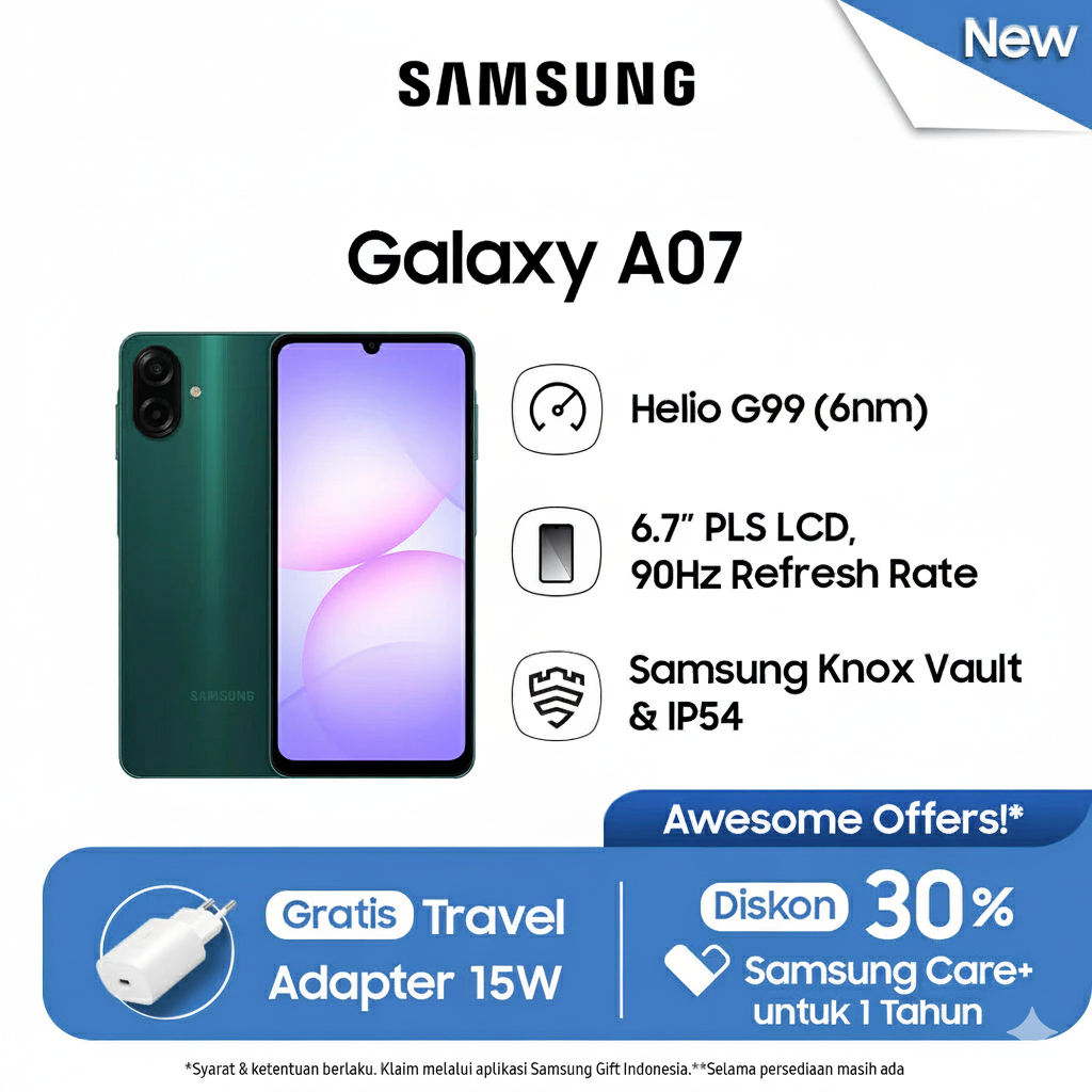 Samsung Galaxy A07 Smartphone 4/64GB Helio G99 (6nm) 90hz Refresh Rate IP54 Free Adaptor 15w