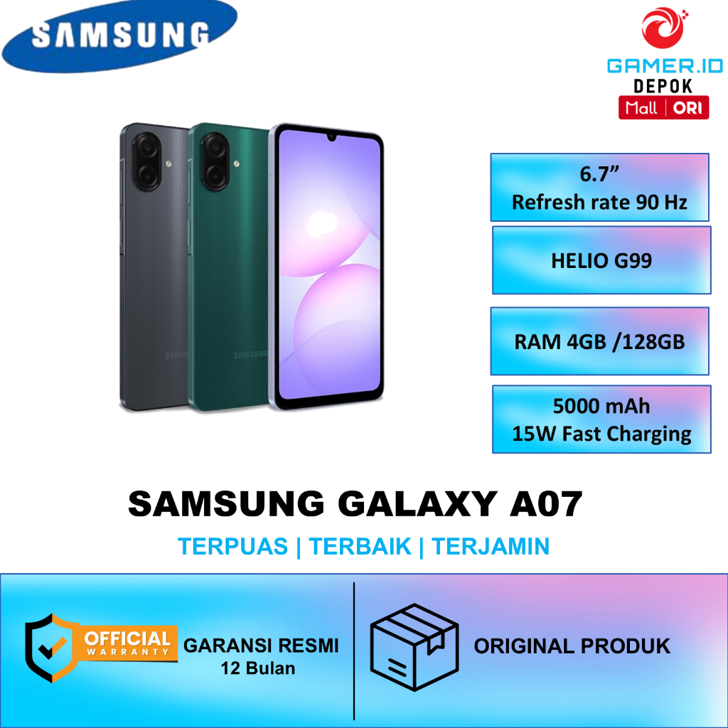 NEW SAMSUNG GALAXY A07 RAM 4GB INTERNAL 64 GB BATERAI 5000 mAh GRATIS ADAPTOR 15 WATT HELIO G99
