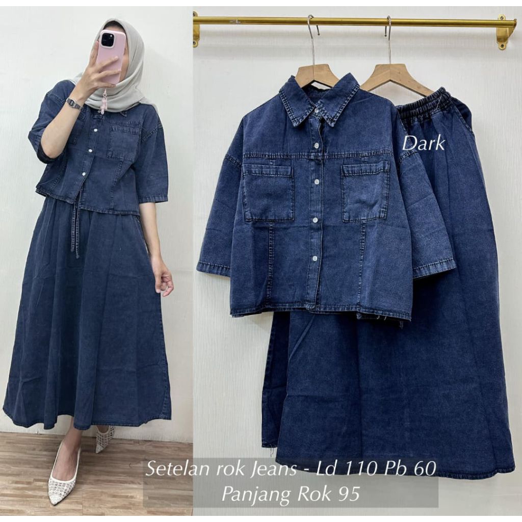 SETELAN KEMEJA LENGAN PENDEK DAN ROK JEANS PREMIUM (TIDAK KAKU)POLOS JUMBO LD 110