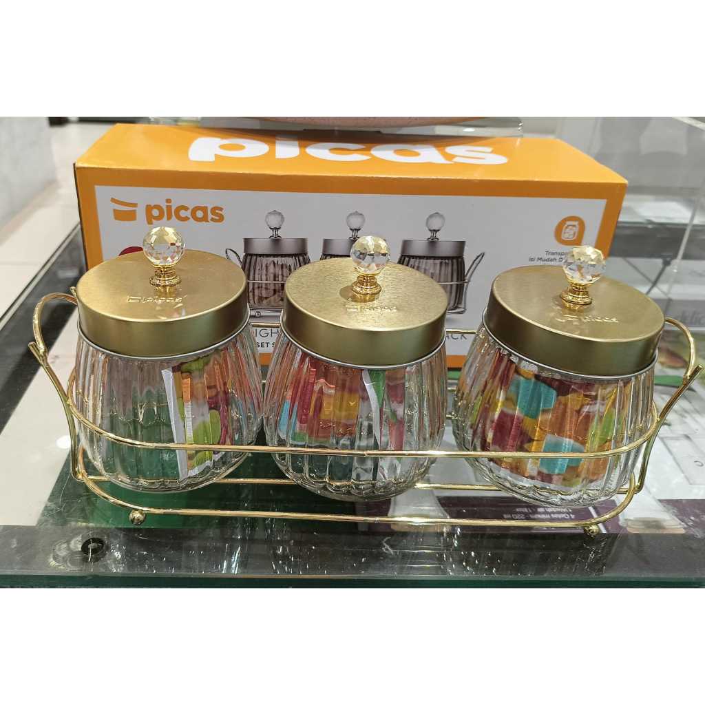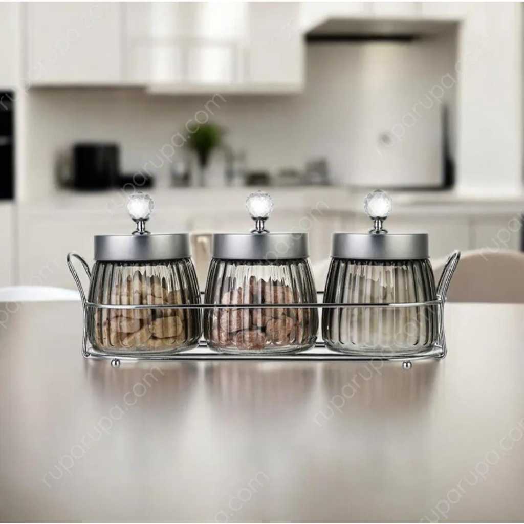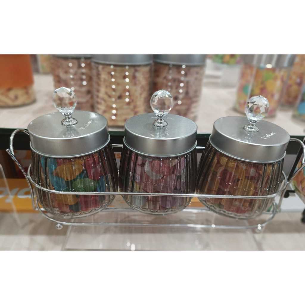 Toples Stoples Kaca Crystal Kedap Udara Set 3 Pcs Dengan Rak Tutup / Silver Mewah