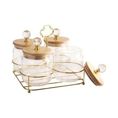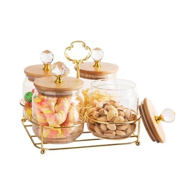 Gia Toples Kaca Kue Snack Model Oval Dengan Tutup Hiasan Diamond Isi 3 Pieces Dengan Rak Tingkat Warna Mewah Eyo If3379