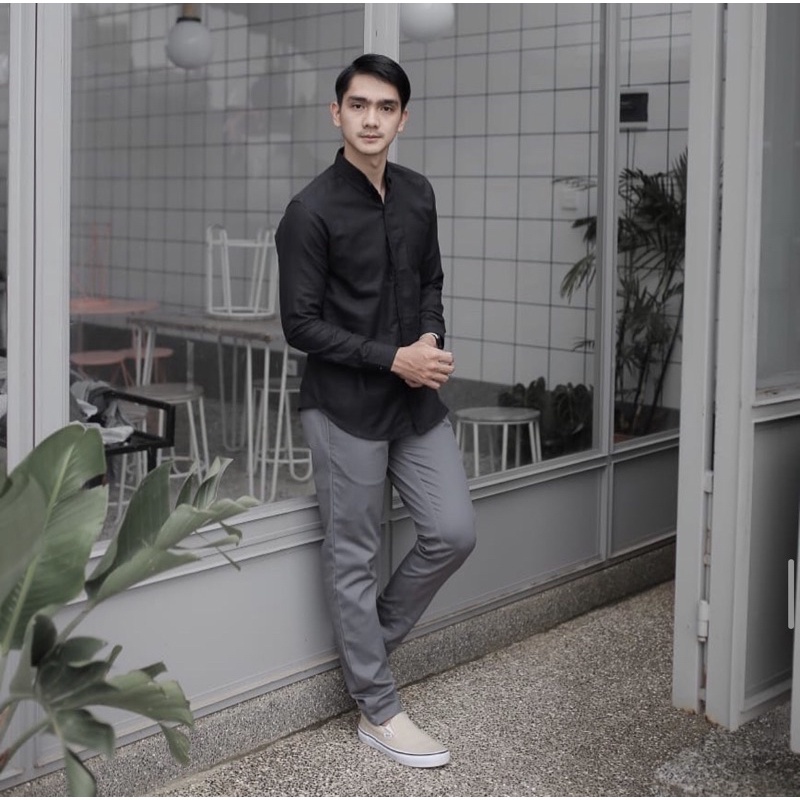 kemeja cowok los lengan panjang slimfit hem pria kantor hitam navy putih maron army