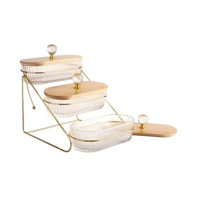 Toples Kaca Kue Snack Model Oval Dengan Tutup Hiasan Diamond Isi 3 Pieces Dengan Rak Tingkat Warna Mewah Eyo If3381