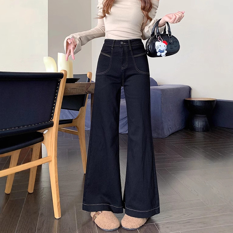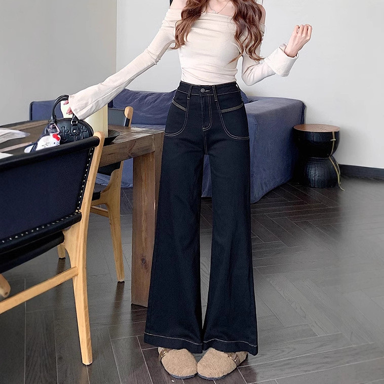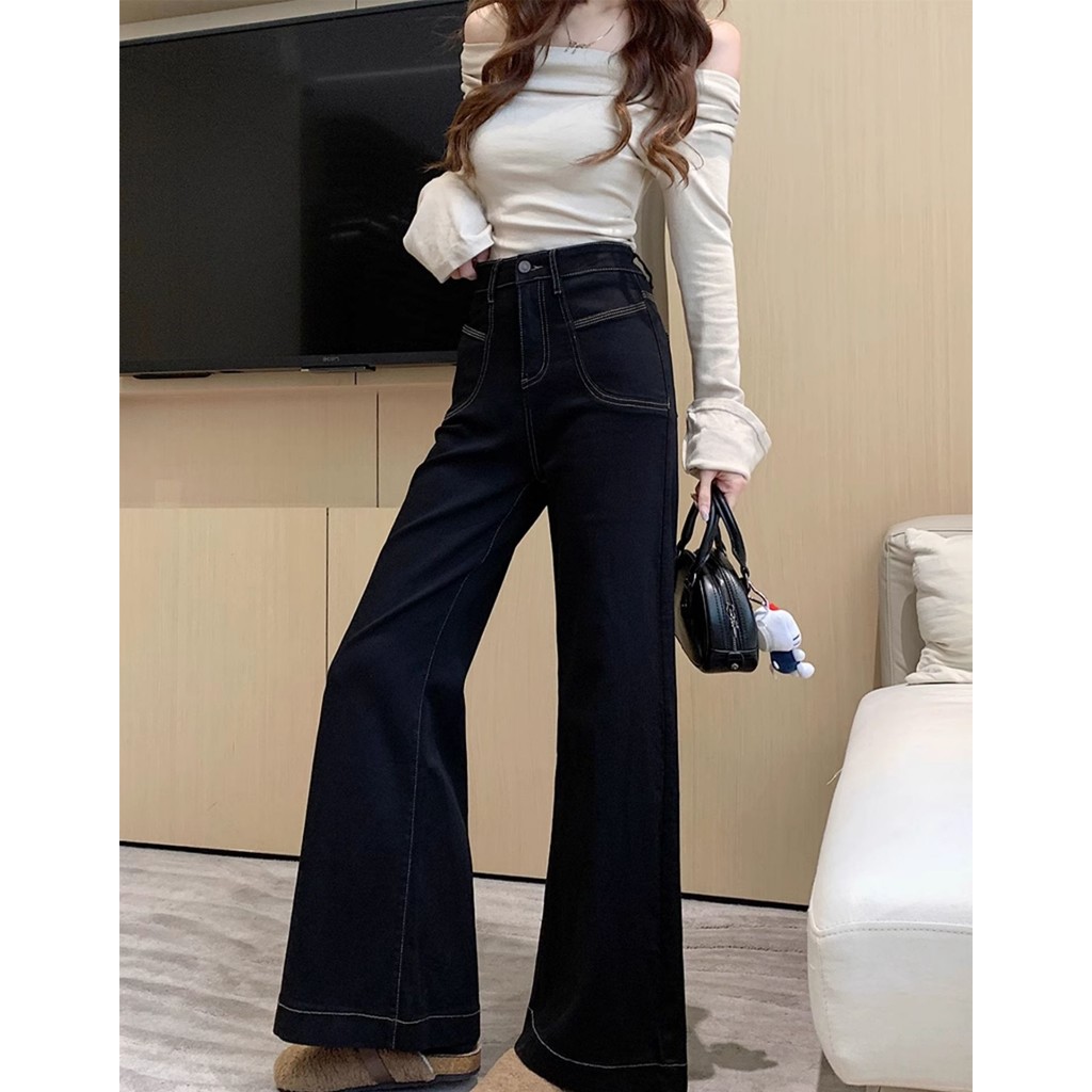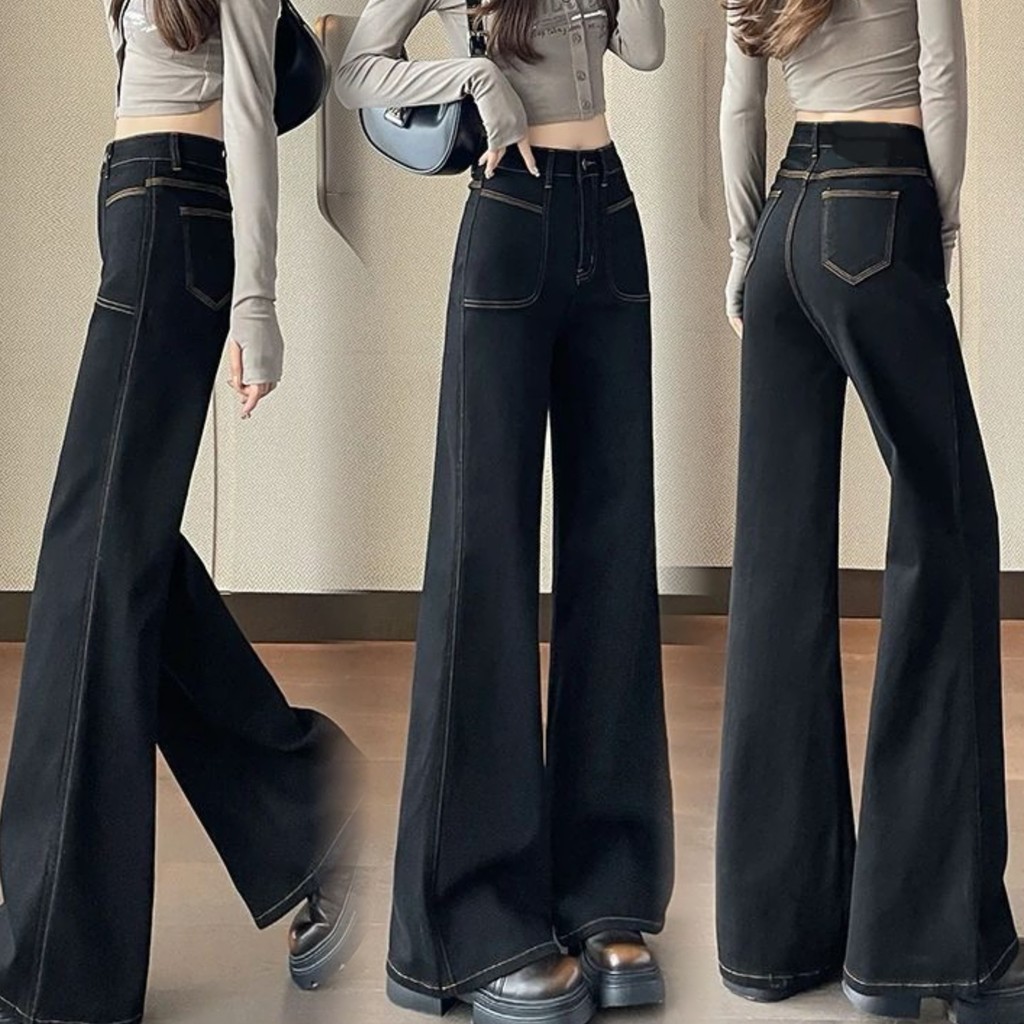S6XL Celana Jeans Wanita Korea Retro Pinggang Tinggi Hitam Melebar Longgar Ramping Celana Jeans Lurus Kaki Lebar