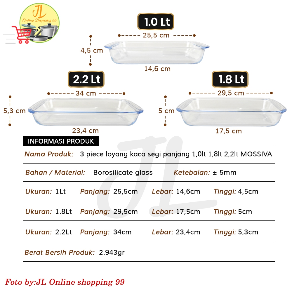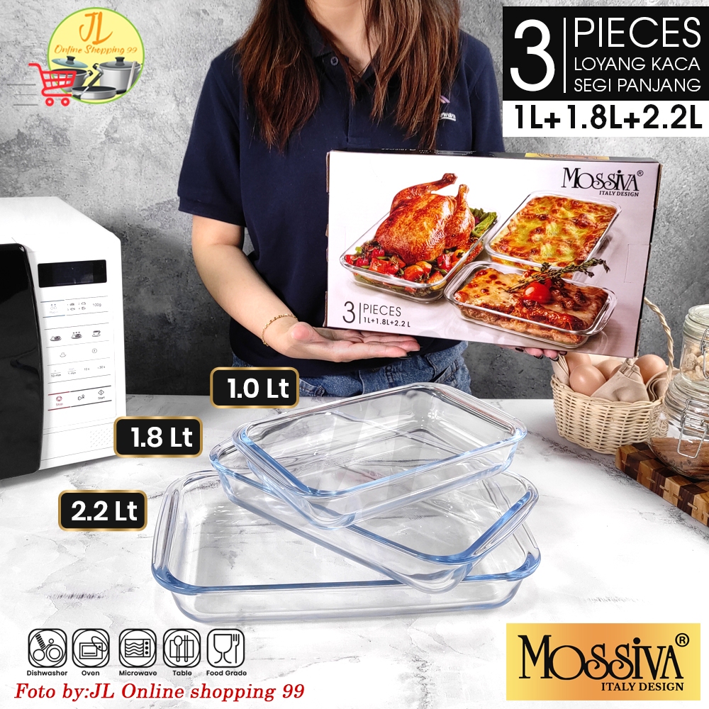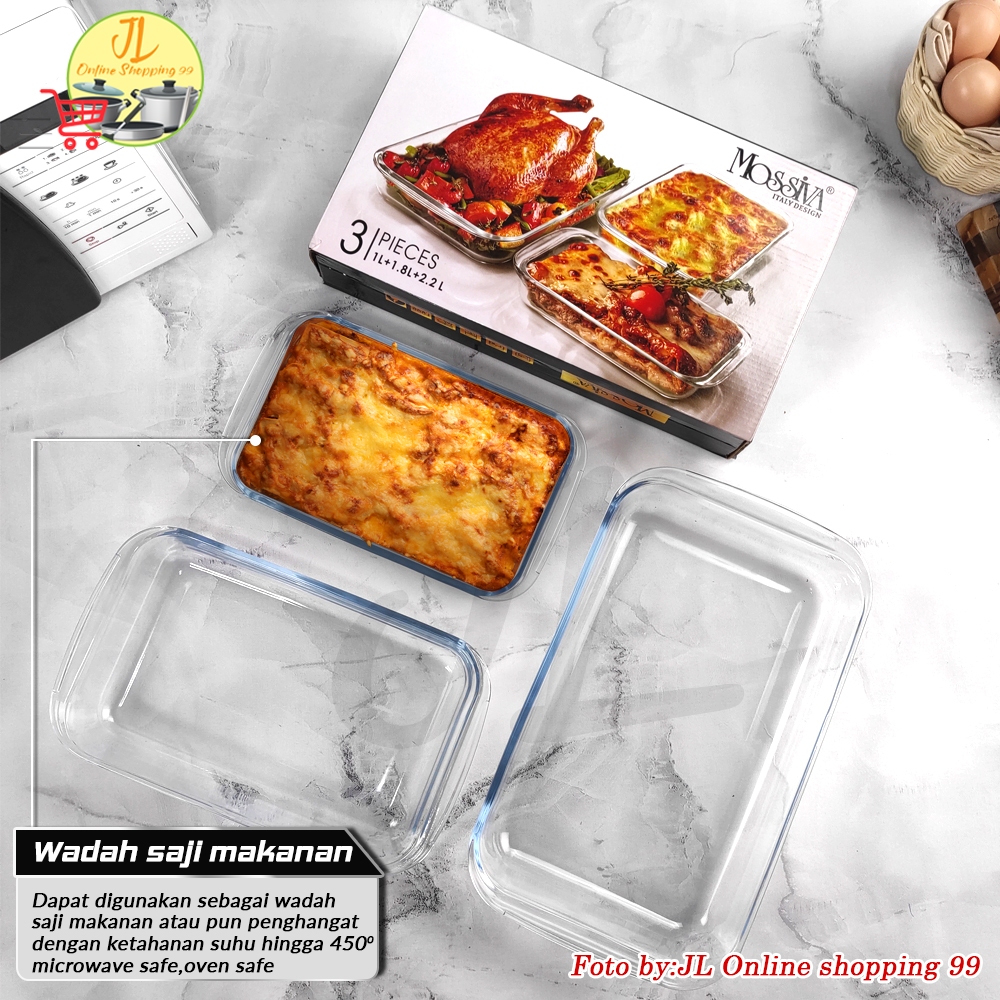 Mossiva Loyang Kaca Prasmanan Set 3 In 1 1000Ml - 1800Ml - 2200Ml Segi Panjang Tahan Panas / Rectangular Wadah Saji Oven
