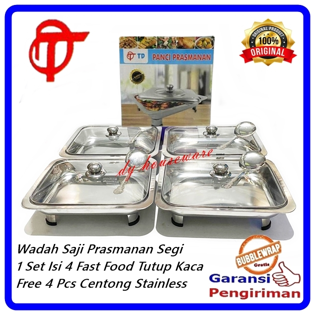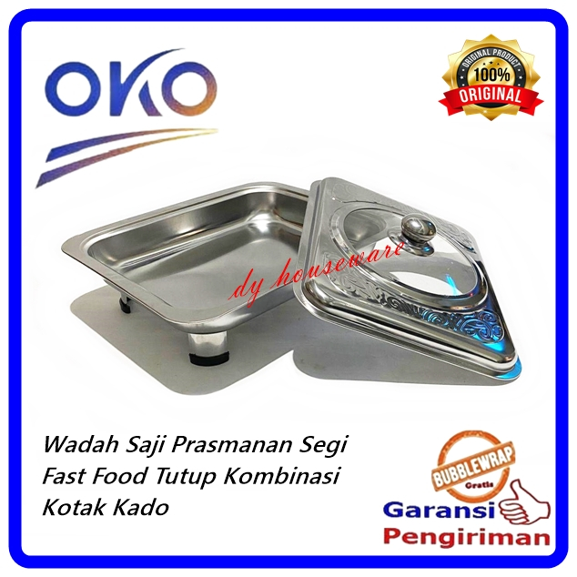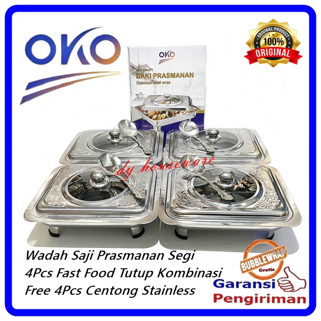 Wadah Saji Prasmanan Segi Stainless Set Tutup Kaca Transparan Set 4 Pcs Free Centong Stainless Oko 555