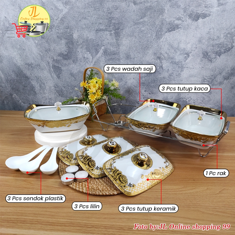 Vicenza Prasmanan Set Segi Isi 3 + Tutup Kaca Dan Keramik + Rak / Cr751-Dc Gemini Alat Saji Dengan Rak / Casserole