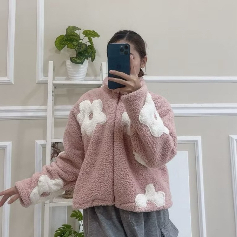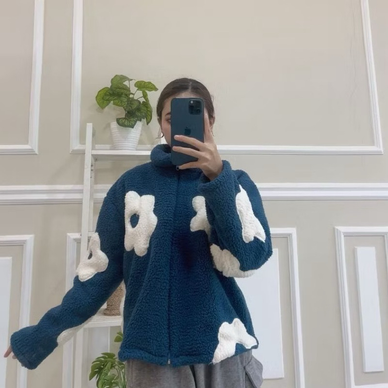 Jaket Sherpa Bulu Wanita Crop Flower Sweater Zipper