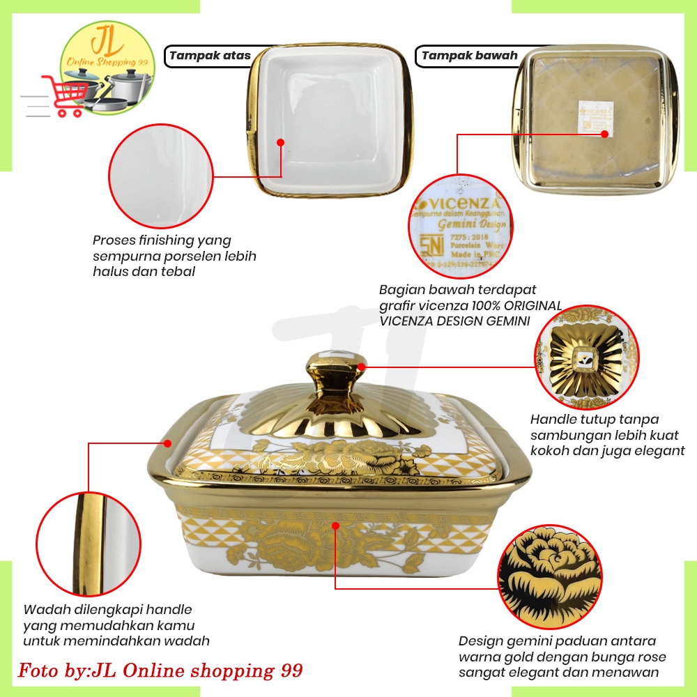 Vicenza 7Pcs Wadah Saji Segi Isi 2Set + Tutup + Rak Motif Gemini Porcelain Hr-43 / Prasmanan Basi Rectanguler Food Warme