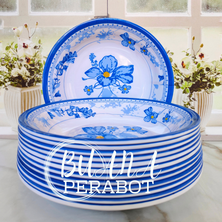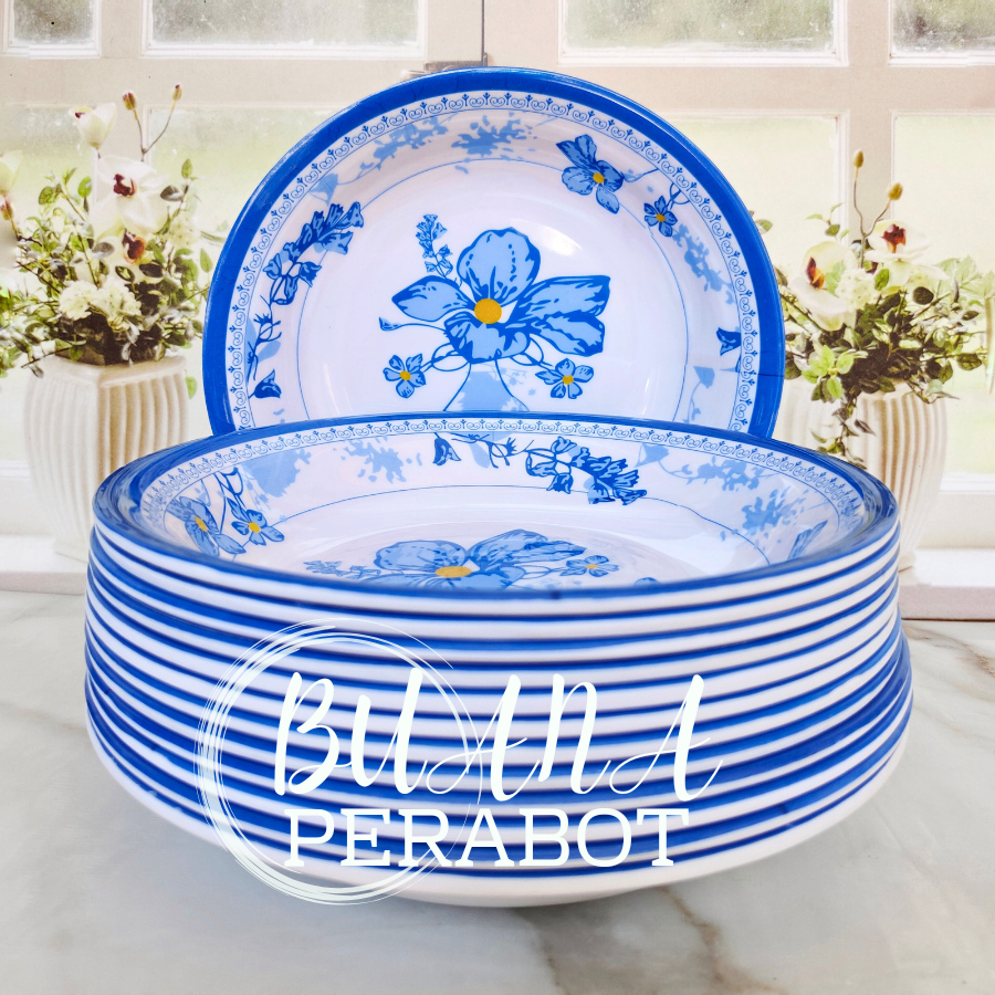 Promo 12 Pcs Piring Melamin Motif Mawar Biru Tebal Ukuran 9 Inchi 23 Cm Model Cekung