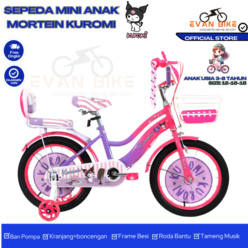 Sale Sepeda Anak Perempuan Mortein Kuromi Lisense Sanrio Musik Ukuran 12 16 18 Inch Keranjang Usia 2-8 Tahun