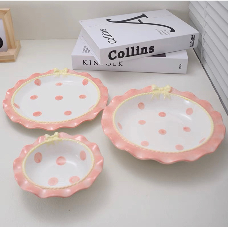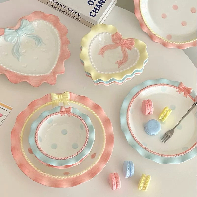 Piring Mangkok Coquette Pita Keramik Motif Aesthetic Ceramic Ribbon Lace Plate Bowl Tableware