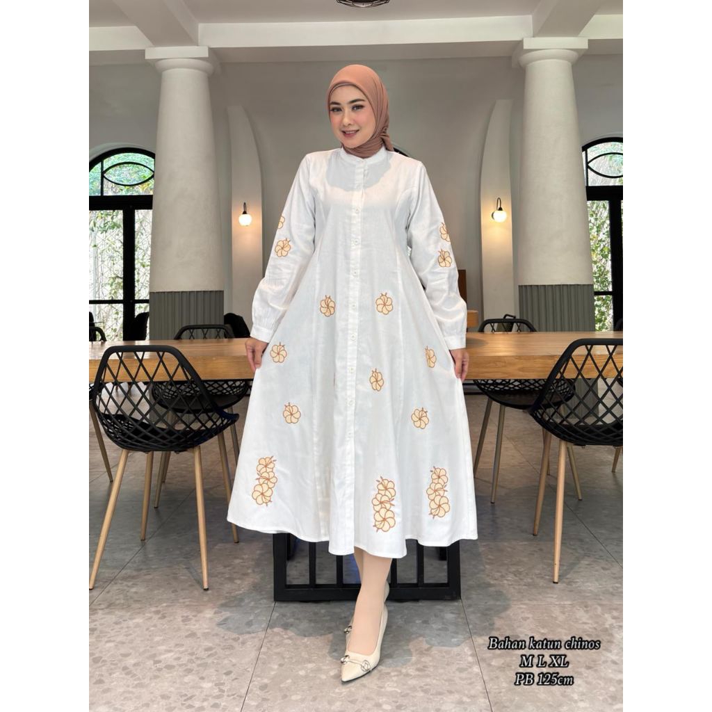 Midi Dress Katun Chinos Bordir | Gamis Chinos Premium | Gamis Midi Bordir Motif Daun | Midi Dress terbaru