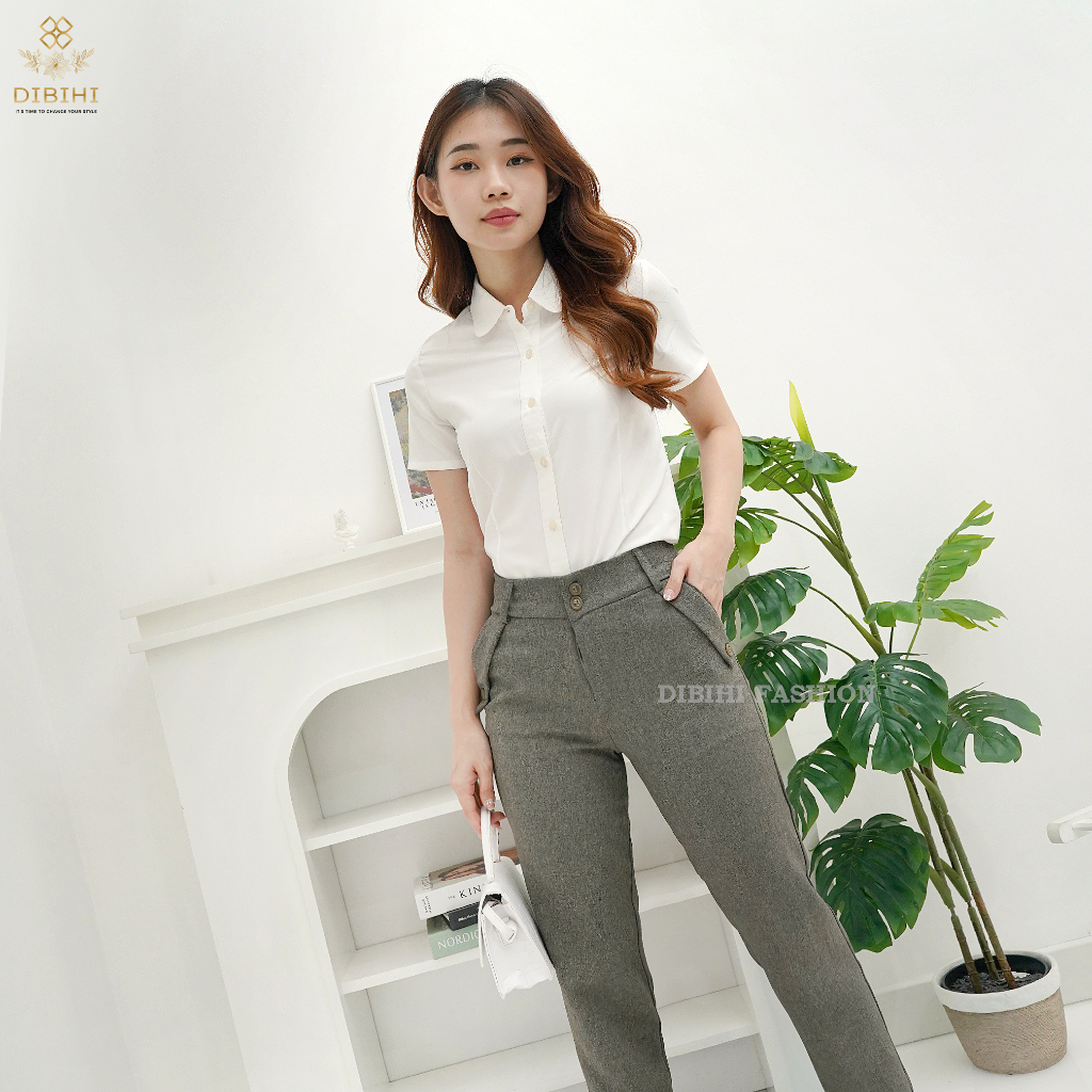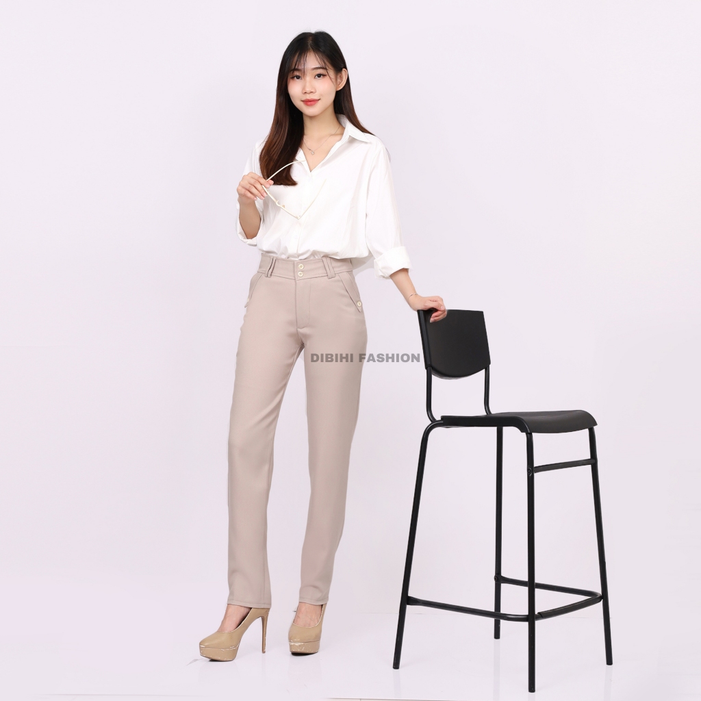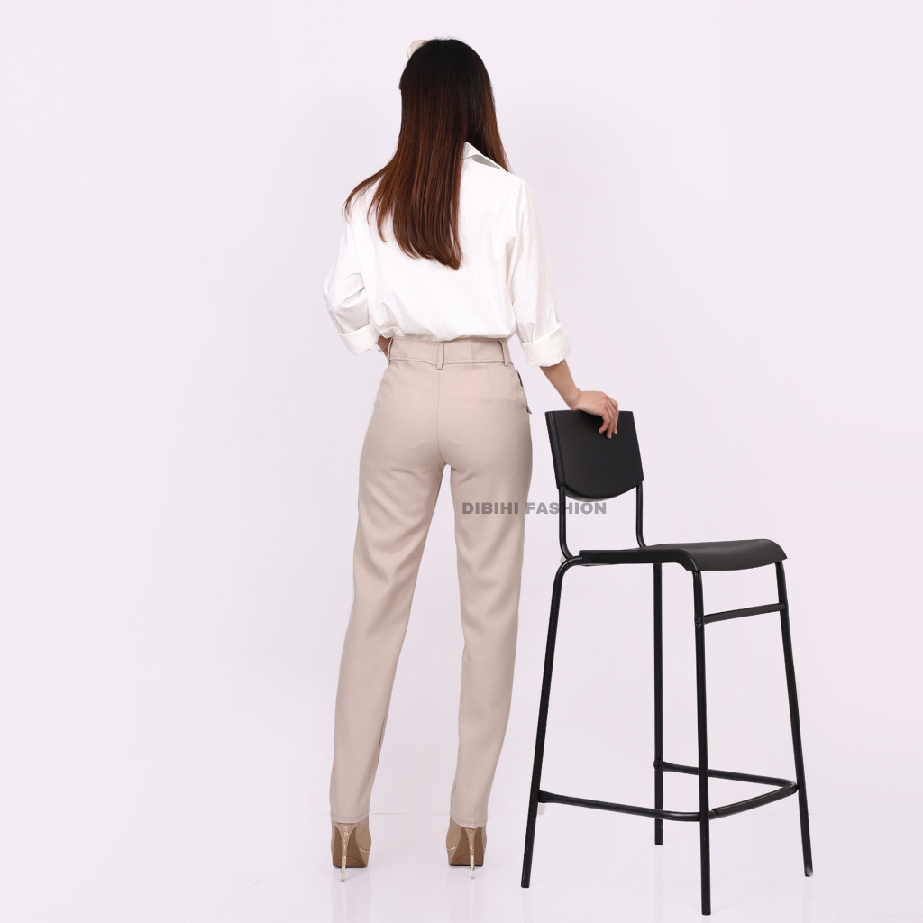 DIBIHI - Celana Bahan Kerja Wanita Kantor Reguler Formal Cream Pinggang Kancing Bahan Dasar Kain