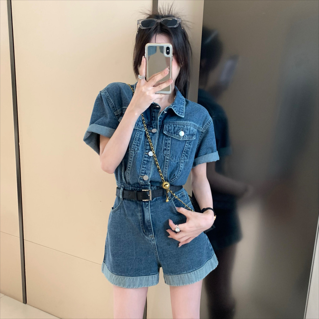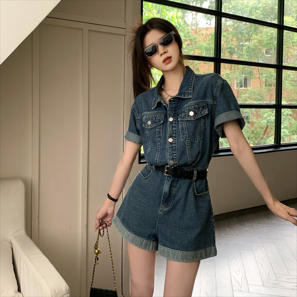 Jumpsuit Pendek Denim Retro dengan Lengan Pendek, Pinggang Lebar, dan Kaki Celana Pendek Baru(Tidak termasuk ikat p